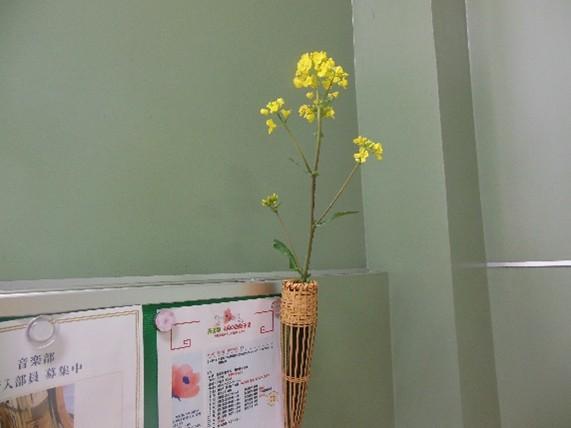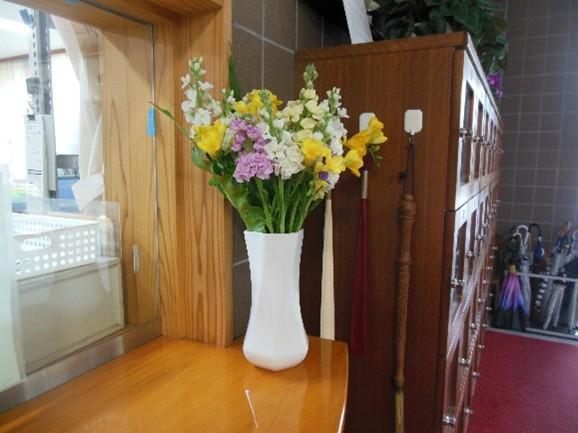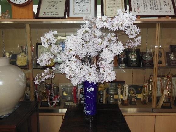 <卒業式の花と校内の春の花が始業式を迎える生徒たちを待っています>